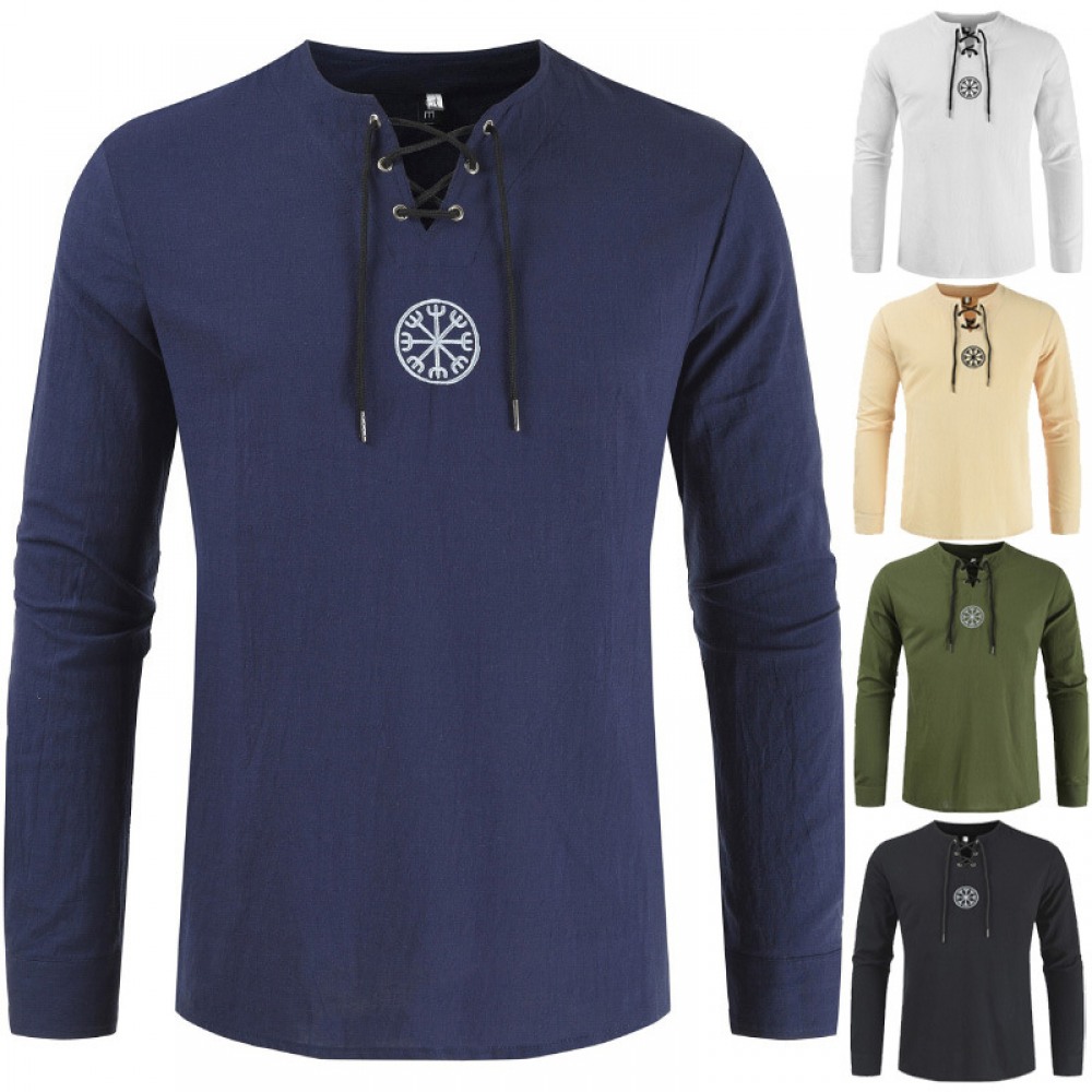Men's Cotton and Linen Long-Sleeved Pullover Fashion Urban Unhooded Stand-Up Collar Men's T-Shirt