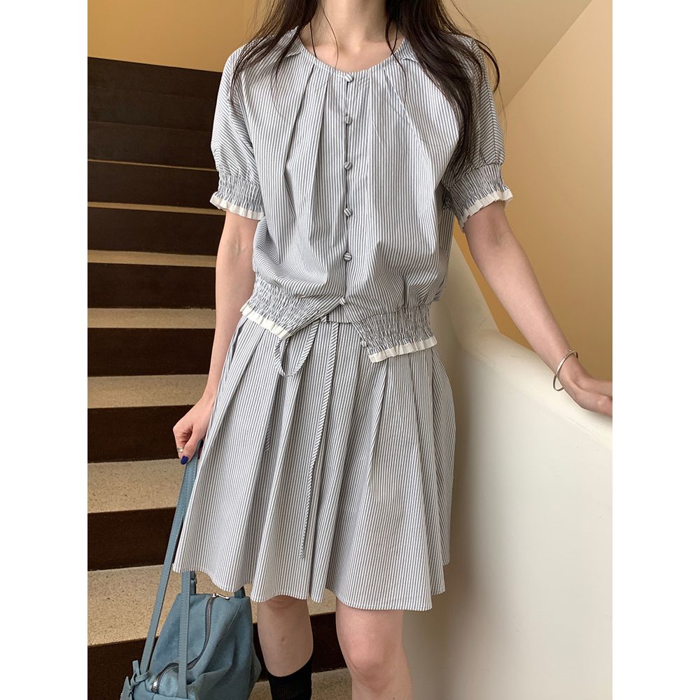 Fashion Striped Short-Sleeved Shirt High Waist A-Line Skirt