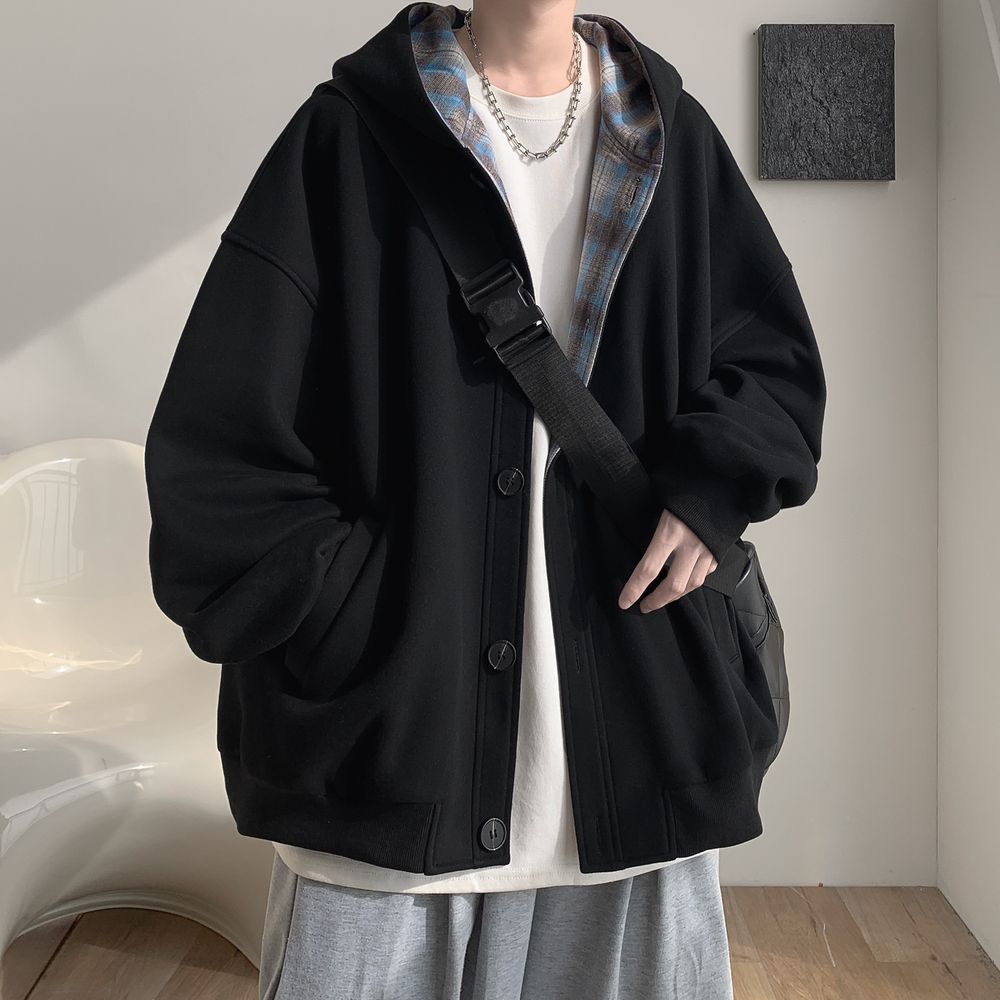Men's Fleece-lined Black Jacket Oversized Loose-fitting Zip-up Hooded Sweatshirt