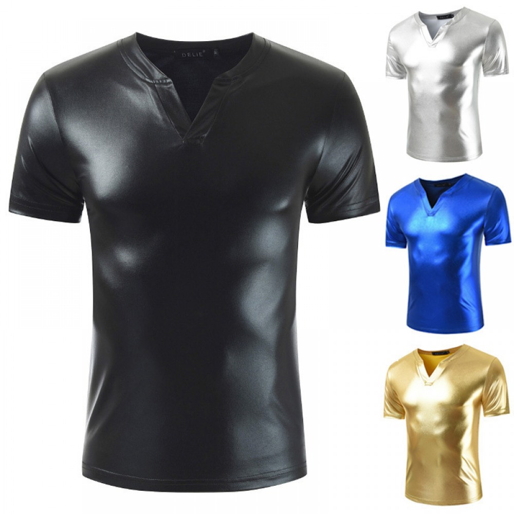 Men's T-Shirt V-Neck Solid Color Shiny Nightclub Design Dynamic Fashion Sexy Mens Short Sleeve T-Shirt